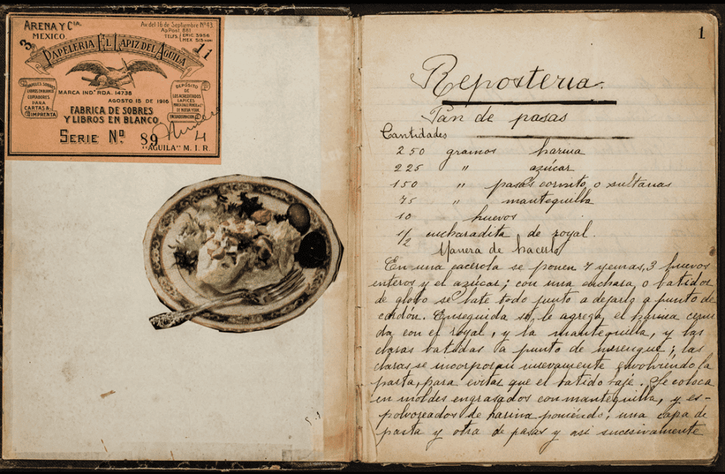 Cuaderno que contiene 184 recetas en español e inglés, que comprenden platos franceses y españoles, así como recetas tradicionales y regionales mexicanas. Las primeras setenta y ocho recetas son postres y dulces. Podemos citar: panque de natas, galletas de almendra, pastel de coco y fresa, dulce de, flan, pescado rosita, mole de guajolote, y otros