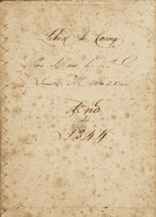 Manuscrito de cocina con treinta y seis recetas. Ejemplo: ensalada reyena, el guaracho, cabritos en adobo, guisado de pichones, caldillo de piñas, cajetas de chirimoya, etc.