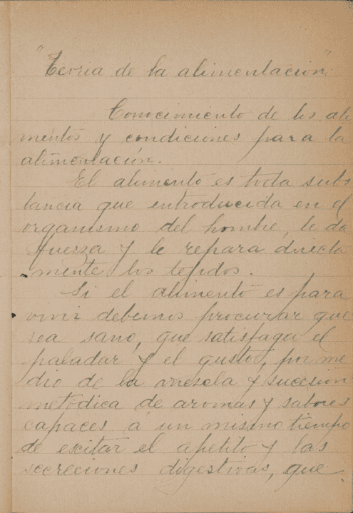 El cuaderno comienza con «Teoría de la alimentación», un ensayo de 7 páginas sobre alimentación saludable. Recetas manuscritas mexicanas: lengua fría, pierna de puerco ajamonada, aguacates rellenos, pambazos compuestos, cubiletes envinados, copitas de crema, rompope, jalea de tejocote y otros